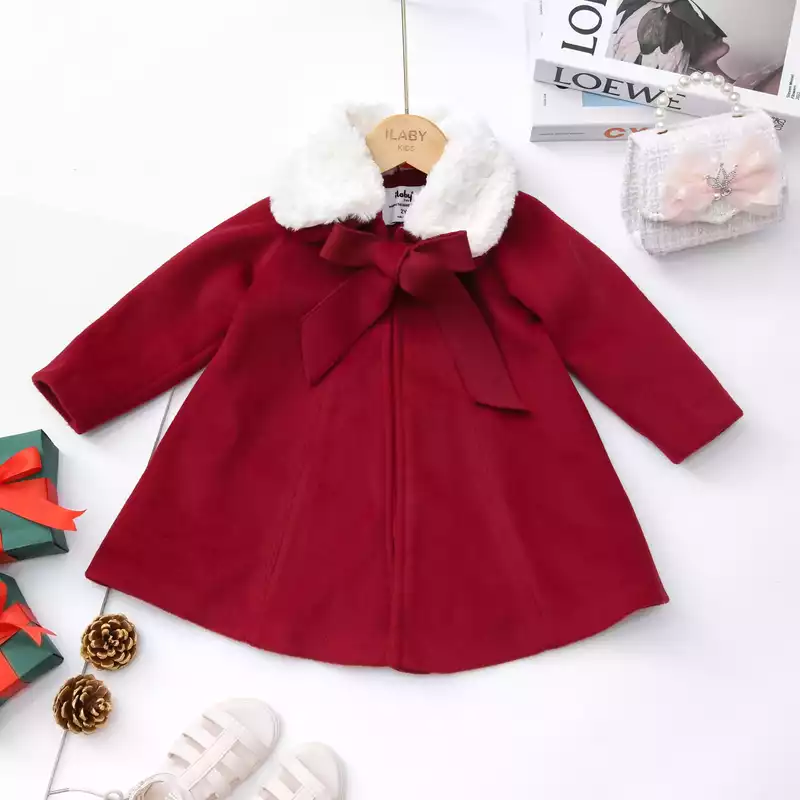 Áo khoác dạ dỏ dài bổ 7 mảnh. Cổ sen, có cổ lông rời đính kèm. Buộc nơ trước, có móc cài giấu bên trong