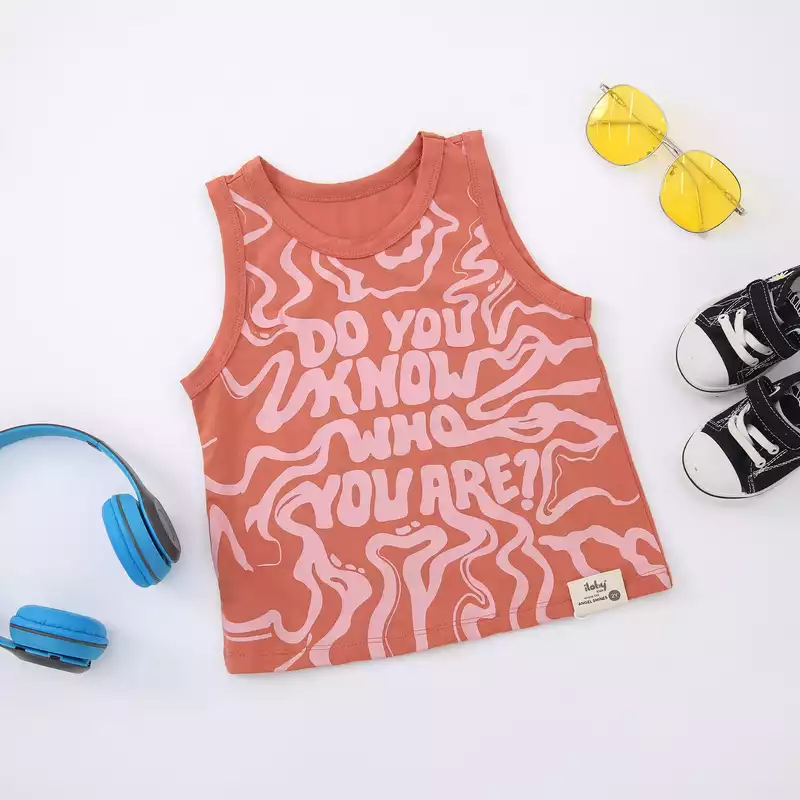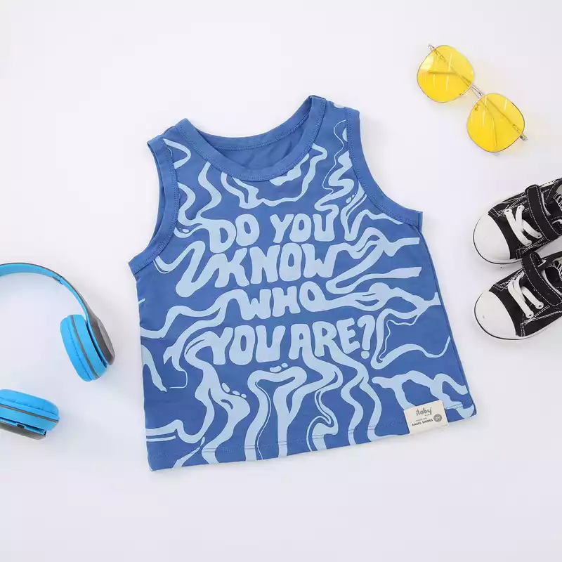 - Thiết kế Áo ba lỗ bé trai cắt sâu nách , viền cổ nách . In chữ " Do you know Who you are ?" ở thân trước.
