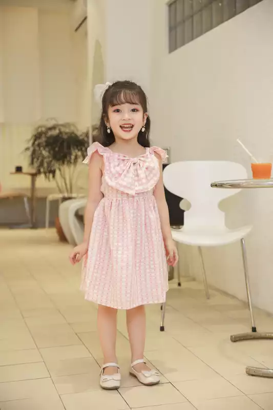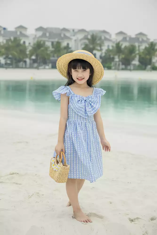ILaby - Nơi thiên thần tỏa sáng - Đầm hai dây bé gái ILABY nơ ngực chất liệu thô kẻ mềm mại thấm hút mồ hôi cho bé 2-11 tuổi