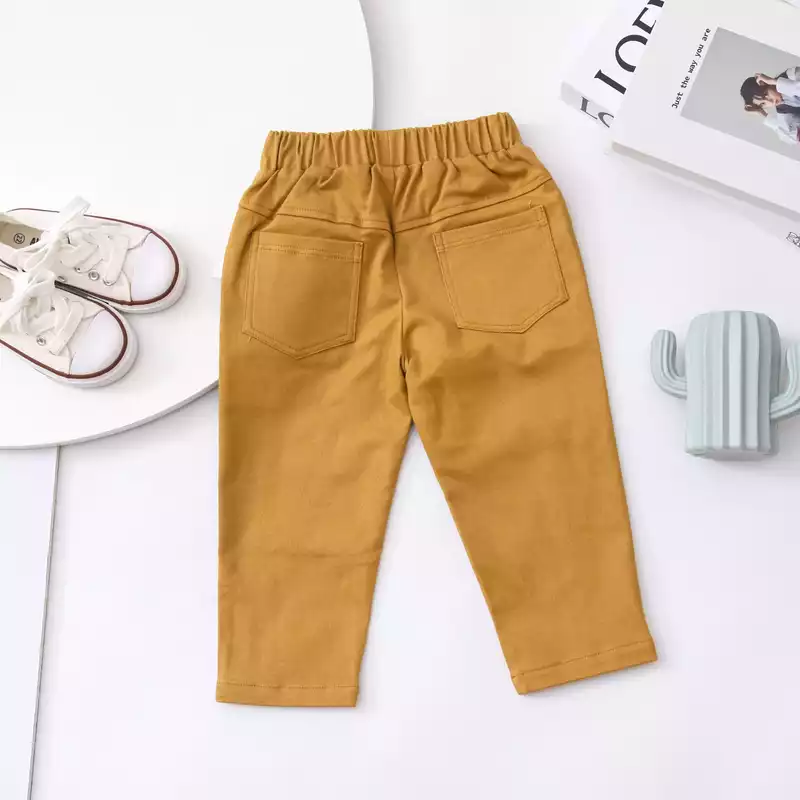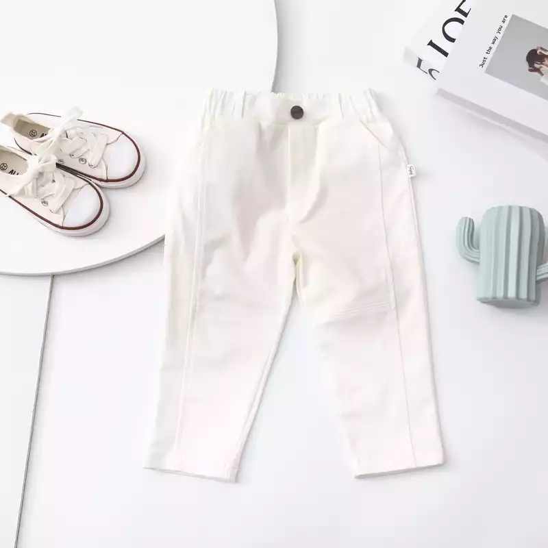 Quần dài bé trai cạp chun, đính cúc. Diễu gân dọc thân trước và gân ngang