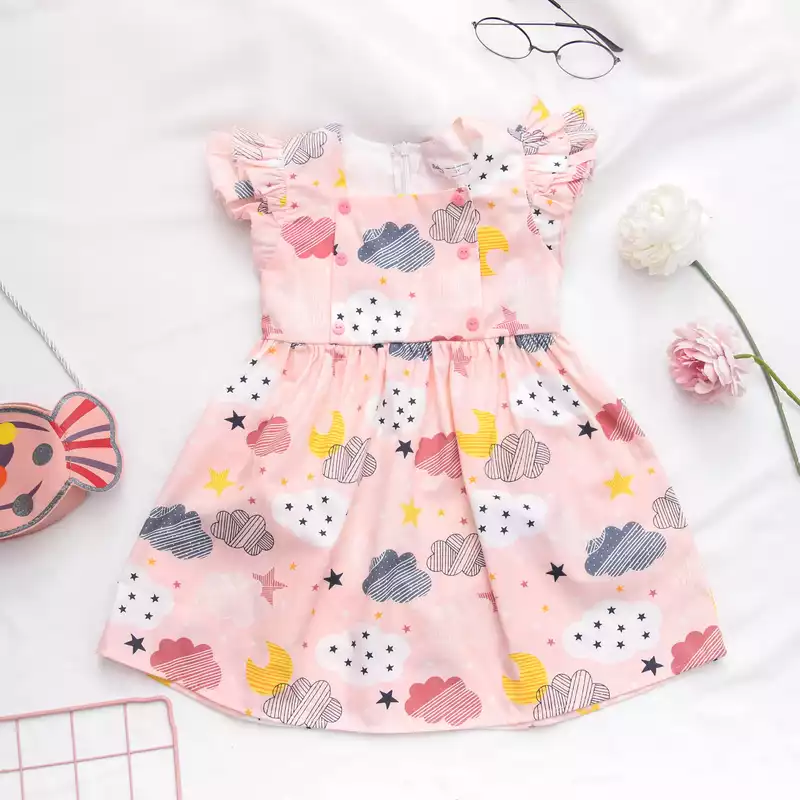 Váy thô in họa tiết cầu vồng và mây, tay xếp 2 tầng bèo, cổ vuông, dài qua gối.